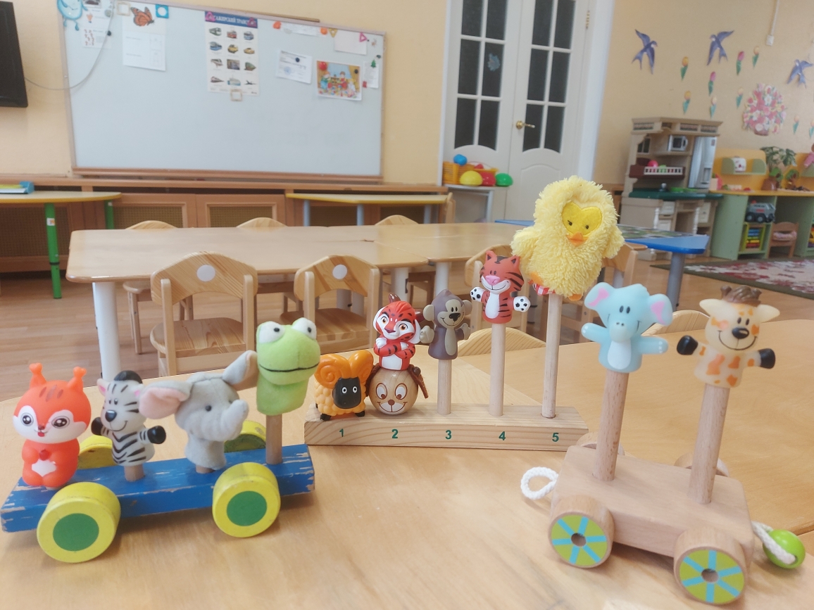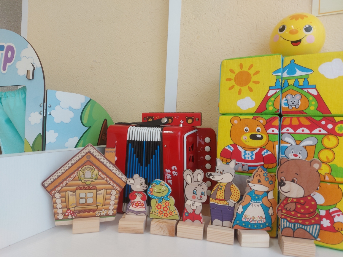 : ● Театральные куклы, используемые воспитателем для игр с детьми и в сюрпризных моментах: - пальчиковый театр - театр на стаканах - куклы «с открывающимся ртом» - куклы театра «би-ба-бо» ● Картинки и игрушки с ярко выраженными эмоциональными состояниями (смеется – плачет) для развития эмоциональной отзывчивости детей ● Различные виды театров для показа воспитателем инсценировок по сказкам: «Теремок», «Репка», «Курочка Ряба»: - настольный театр игрушек - театр картинок (настольный и на фланелеграфе) - настольный театр плоскостных фигур -магнитный театр ● Театрально-игровое оборудование: - ширма - фланелеграф - простейшие декорации ● Для создания музыкального фона в процессе театрально-игровой деятельности: - оборудование для воспроизведения аудиофайлов - аудиозаписи музыкальных программных произведений, шумотека - простейшие музыкальные игрушки –погремушки, бубен, барабан