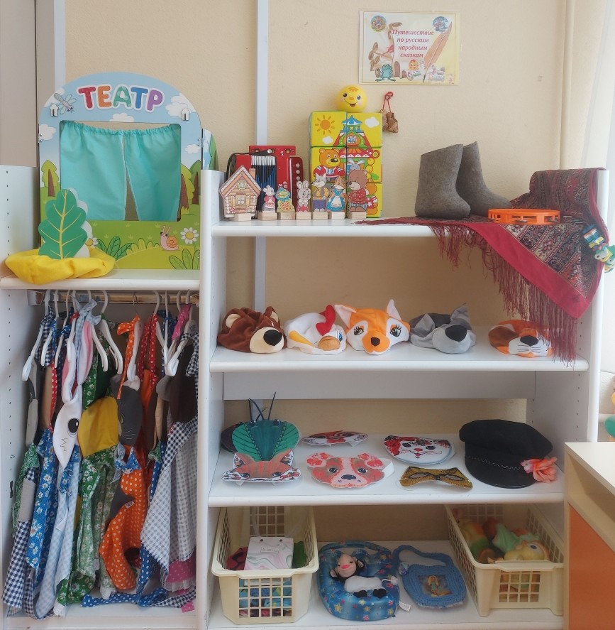 : Маски и костюмы для сказок, например «Репка», «Теремок»; "Курочка Ряба","Колобок"; Одежда или элементы рабочего наряда врача, продавца, шофёра, повара, парикмахера; Маски, картинки домашних и диких зверей; Отдельные детали одежды для составления образов (шляпы, юбки, платки, сумки, очки); Простые музыкальные инструменты (погремушки, бубен, барабан).