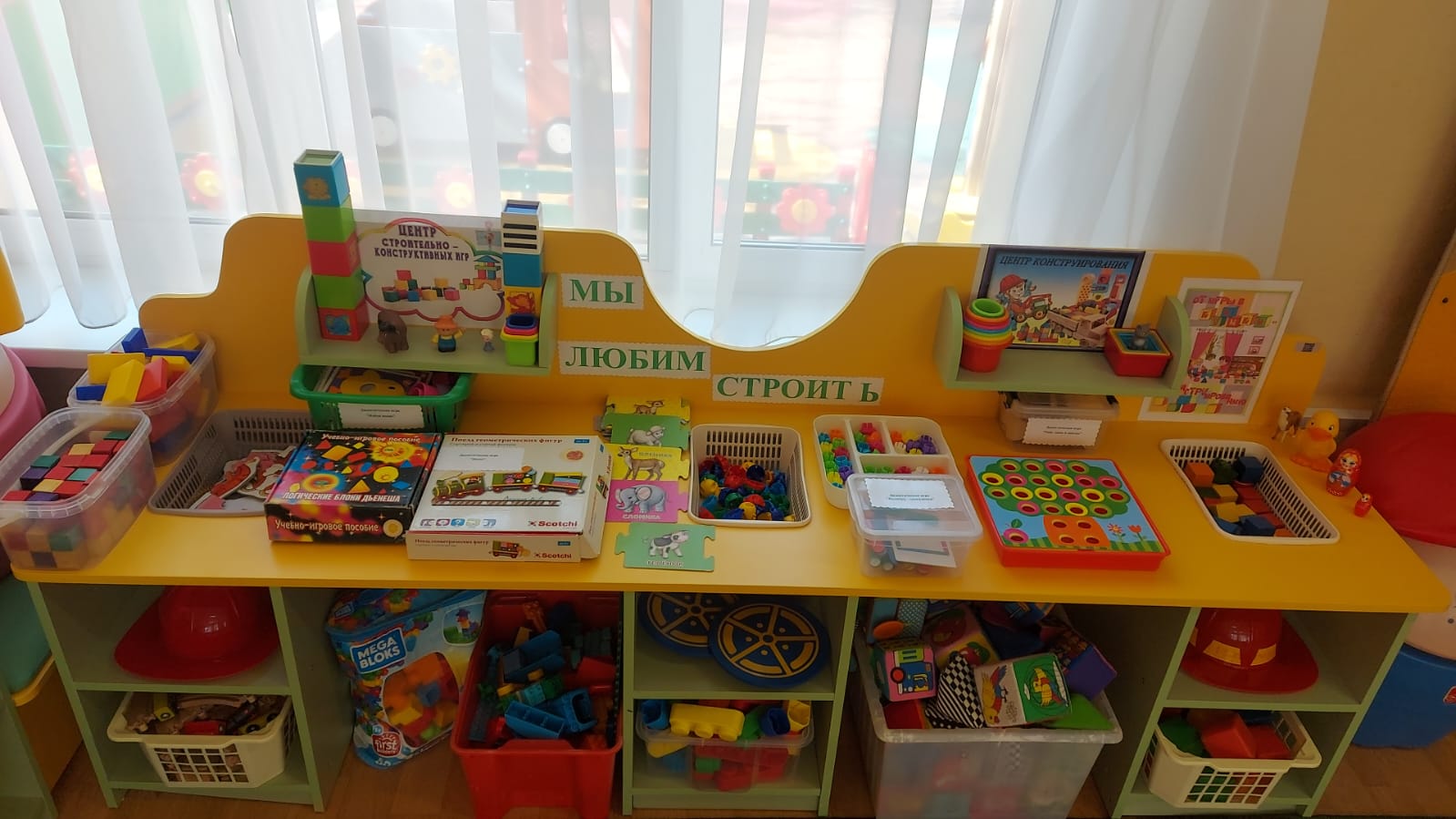 : Наполняемость центра конструирования 1. Напольные конструкторы 1.1 Крупно и средне - габаритный лего конструктор; с простым блочным соединением - крупно габаритный лего. Традиционный конструктор из блоков, соединяющихся между собой посредством «прирощенных» цилиндров. 1.2 Мягкий модульный конструктор; 1.3 Деревянный конструктор (деревянная железная дорога) 1.4 Напольная мозаика 2. Настольные конструкторы с различным типом соединения 2.1 Без соединения – кубики деревянные окрашенные и неокрашенные. Они не требуют скрепления между собой, достаточно устанавливать одну фигуру на другую и комбинировать их, чтобы построить и кукольную мебель, и замок для принцессы, и страшного монстра, которого малыш с удовольствием утихомирит. 2.2 Мозаика различных форм (круглая, квадратная, треугольная, прямоугольная, многоугольная) и размеров ( средняя, крупная) 2.3 Пазлы из двух частей 2.4 Счётные палочки 2.5 Блоки Дьенеша 2.6 Пазл-конструктор "Уши, лапы и хвосты" 2.7 Палочки-смекалочки 3. Дидактические игры • 3.1 Береги предмет (Не отдам свой кубик!) • 3.2 Не опоздай • 3.3 Дидактическая игра "Веселые фигурки " • 3.4 "Палочки - смекалочки" • 3.5 "Уши, лапы и хвосты" • 3.6 Дидактическая игра "Поезд" • 3.7 Дидактическая игра "Мама и малыш" Игровой материал (для обыгрывания постройки, образца) машины разных размеров, спецмашины (пожарная, полиция, скорая), дома, фигурки людей и животных, макеты деревьев и кустарников.